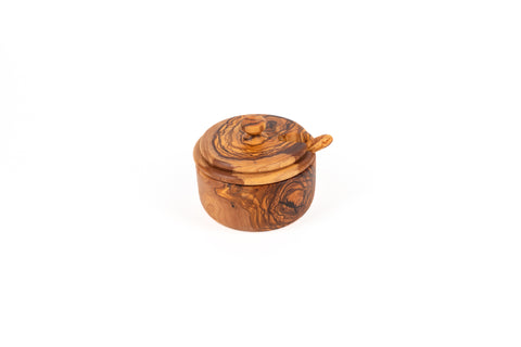 A beautiful example of the coveted grain pattern of authentic olive wood, this handcrafted sugar and spice pot features a simple design that allows the natural beauty of the wood to steal the show. Carved out of a single piece of high density grain olive wood, this seasoning jar is durable and resistant to splitting. The pot lid is topped with a small ball for easy handling and features a small notch to accommodate the free wooden serving spoon. As wood naturally absorbs moisture, this hand carved olive wood spice keeper is a natural option to keep your sugar, spice, and everything nice from damaging moisture.